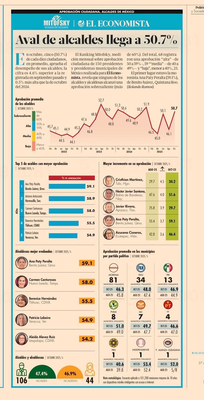 De acuerdo con Mitofsky, la medición incluyó a más de 101 mil personas mayores de 18 años con acceso a Internet y dispositivos móviles, en los municipios más relevantes del país. El estudio destaca además que, por segunda vez en el año, el promedio nacional de aprobación de los alcaldes supera el 50 por ciento, un indicador de mayor confianza ciudadana hacia los gobiernos locales.