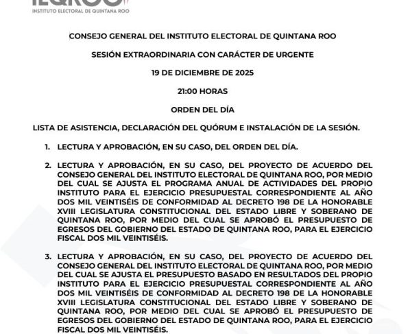 El Instituto Electoral de Quintana Roo (IEQROO) informó sobre la realización de una sesión extraordinaria del Consejo General con carácter de urgente, la cual se llevará a cabo el 19…