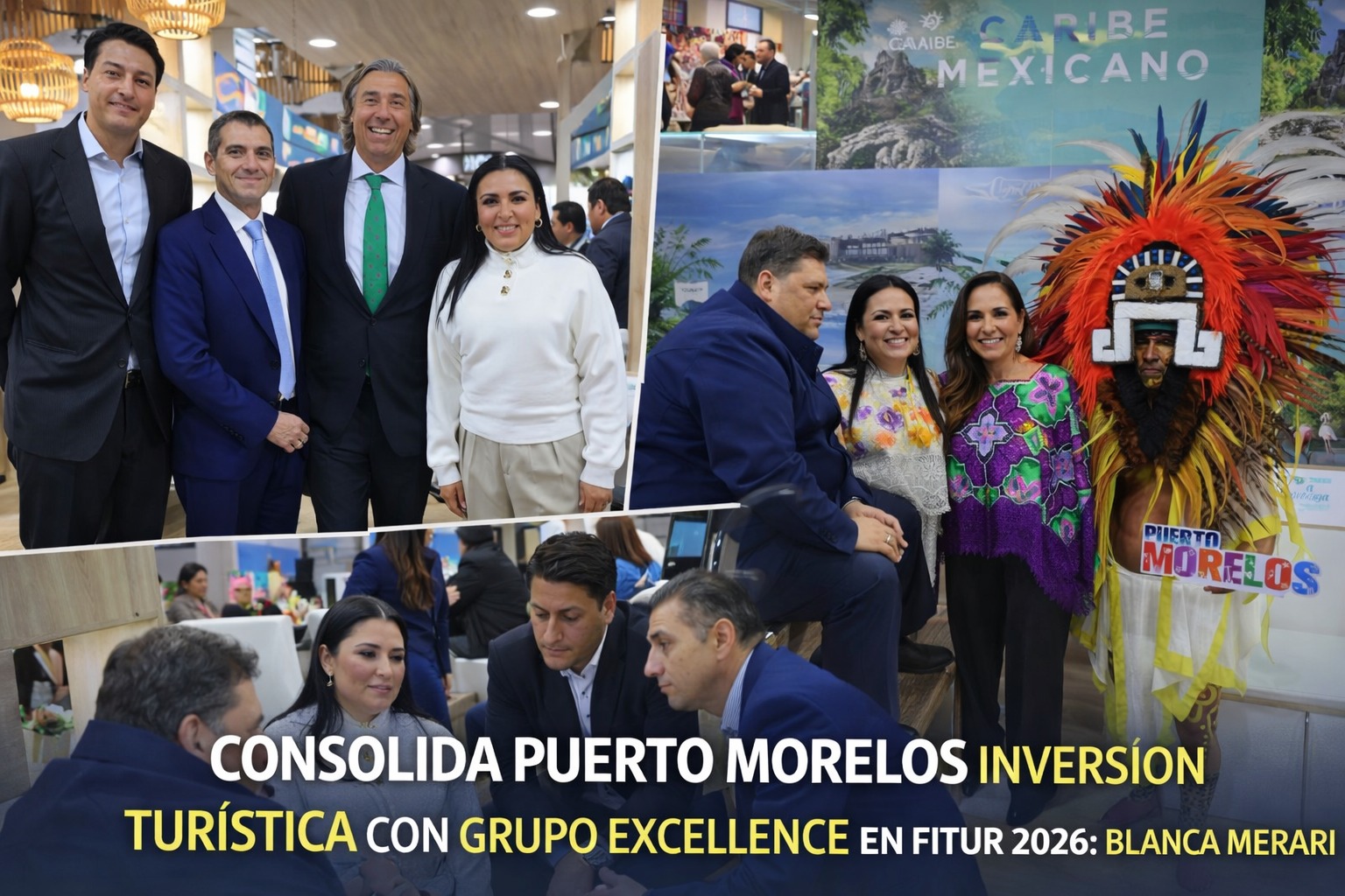 Madrid, España, 22 de enero de 2026.— En el marco de la 46ª edición de la Feria Internacional de Turismo (FITUR), la presidenta municipal de Puerto Morelos, Blanca Merari Tziu Muñoz, sostuvo una reunión estratégica con directivos del Grupo Excellence, en la que se refrendó la confianza y el compromiso de inversión turística de esta importante cadena hotelera en el municipio.