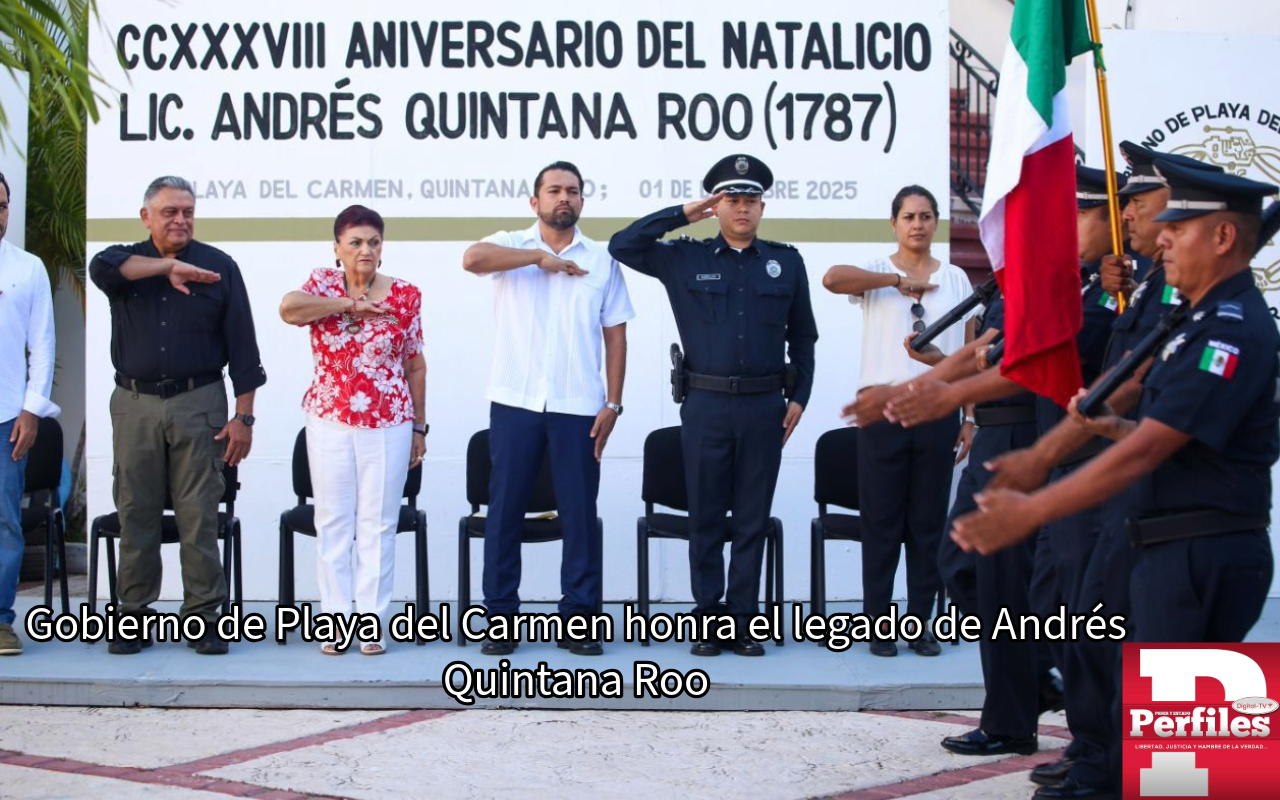 Playa del Carmen, Quintana Roo, 1 de diciembre de 2025.— En representación de la presidenta municipal Estefanía Mercado, la secretaria Jurídica y Consultiva del Ayuntamiento, Mayra Angélica Castelo Chapa, encabezó la ceremonia cívica por el 238 aniversario del natalicio de Andrés Quintana Roo, prócer de la patria cuyo legado perdura en la construcción de México y da nombre al estado que hoy honra su memoria.