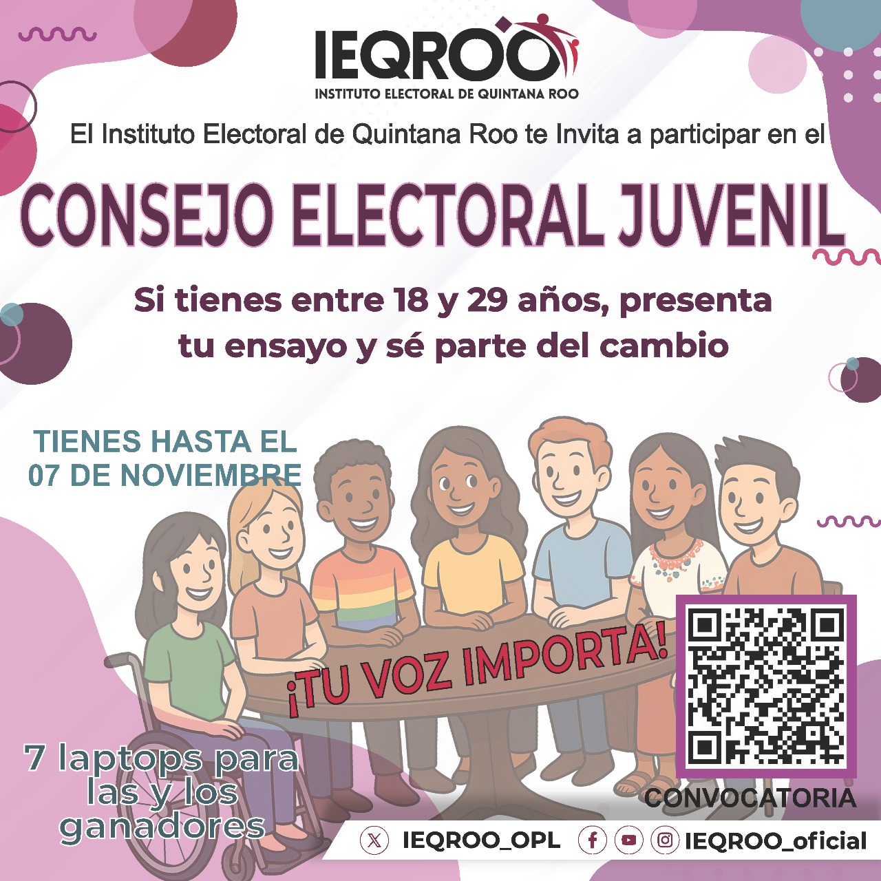 Chetumal, Quintana Roo, octubre de 2025. – Con el propósito de impulsar la participación activa de las juventudes en la vida democrática del estado, el Instituto Electoral de Quintana Roo (IEQROO) lanzó la convocatoria para formar parte del “Consejo Electoral Juvenil del Estado de Quintana Roo 2025” (CEJ 2025).