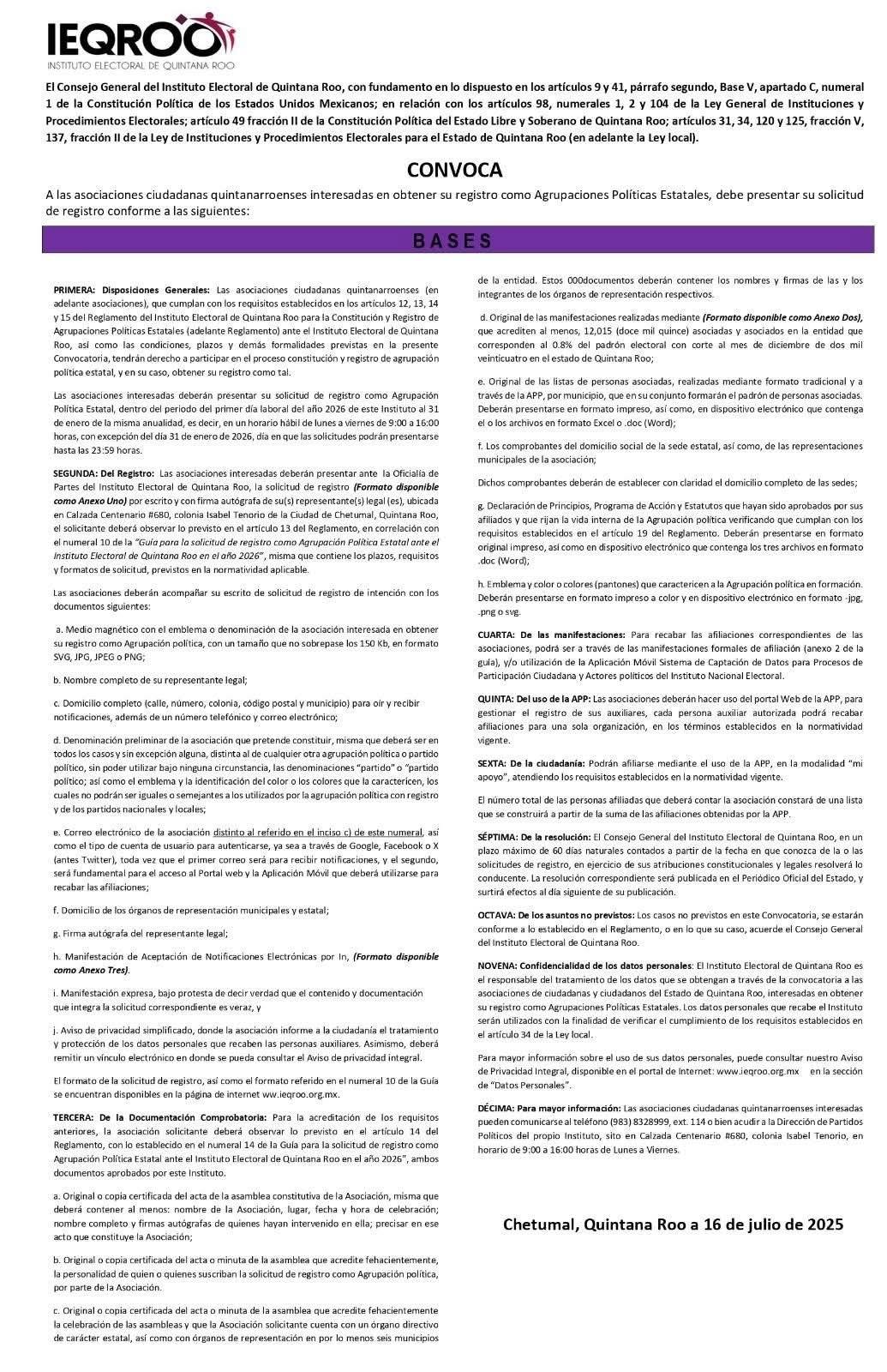 El Instituto Electoral de Quintana Roo (IEQROO_oficial) anunció la apertura del periodo para que asociaciones ciudadanas interesadas obtengan su registro como Agrupaciones Políticas Estatales (APEs).Las solicitudes deberán presentarse durante el mes de enero de 2026, en la Oficialía de Partes del IEQROO, ubicada en Calzada Centenario #680, colonia Isabel Tenorio, en la ciudad de Chetumal. El formato de solicitud está disponible como Anexo Uno en la convocatoria oficial.