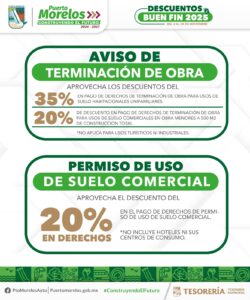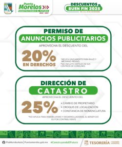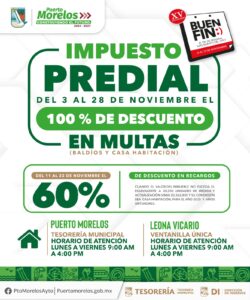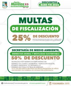 Puerto Morelos, Quintana Roo, 7 de noviembre de 2025.— La presidenta municipal Blanca Merari Tziu Muñoz recordó a los contribuyentes portomorelenses la puesta en marcha de la Jornada de Descuentos “El Buen Fin 2025”, que comenzó el lunes 3 del presente mes y concluirá el viernes 28, a fin de que obtengan importantes rebajas en multas y recargos.