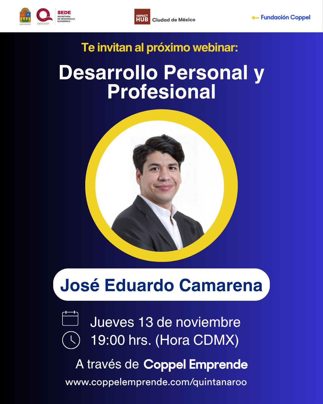 Con el objetivo de fortalecer las habilidades de quienes buscan crecer en el ámbito emprendedor, Coppel Emprende anunció la realización de un nuevo webinar titulado “Desarrollo Personal y Profesional”, que se llevará a cabo el jueves 13 de noviembre a las 19:00 horas (tiempo de la Ciudad de México).