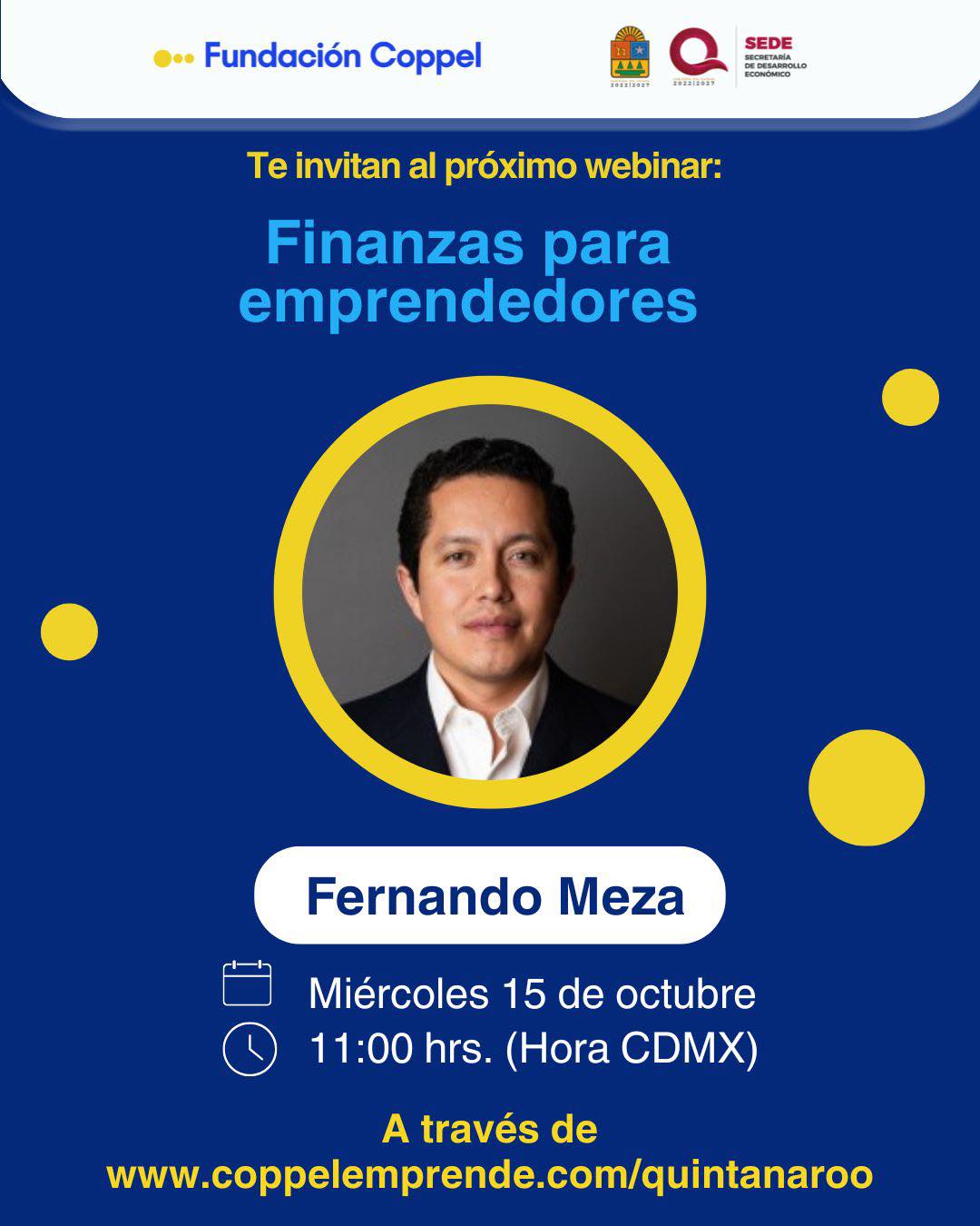 La sesión será transmitida a través del sitio oficial www.coppelemprende.com/quintanaroo y estará a cargo del especialista Fernando Meza, quien compartirá estrategias prácticas para mejorar la administración de recursos, optimizar inversiones y fortalecer la sostenibilidad de los proyectos emprendedores.