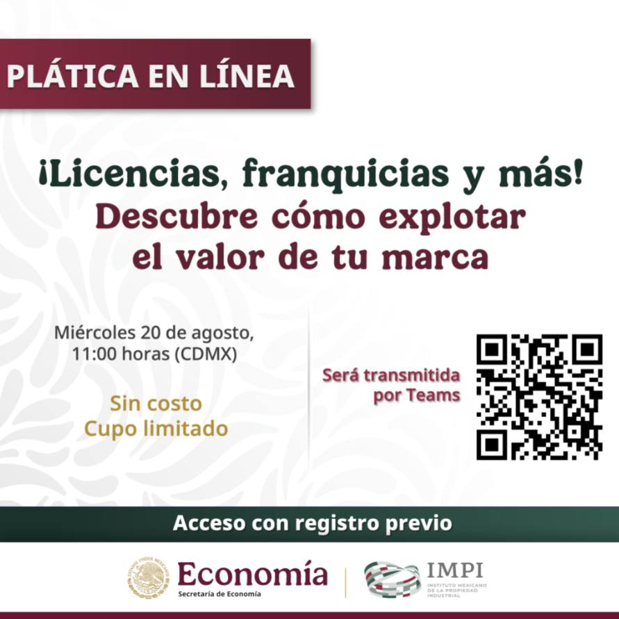 La plática se llevará a cabo este miércoles 20 de agosto a las 11:00 horas (tiempo del centro de México) a través de la plataforma Microsoft Teams, y busca ofrecer herramientas clave para que los participantes comprendan cómo capitalizar sus marcas mediante licencias, franquicias u otras estrategias de comercialización.