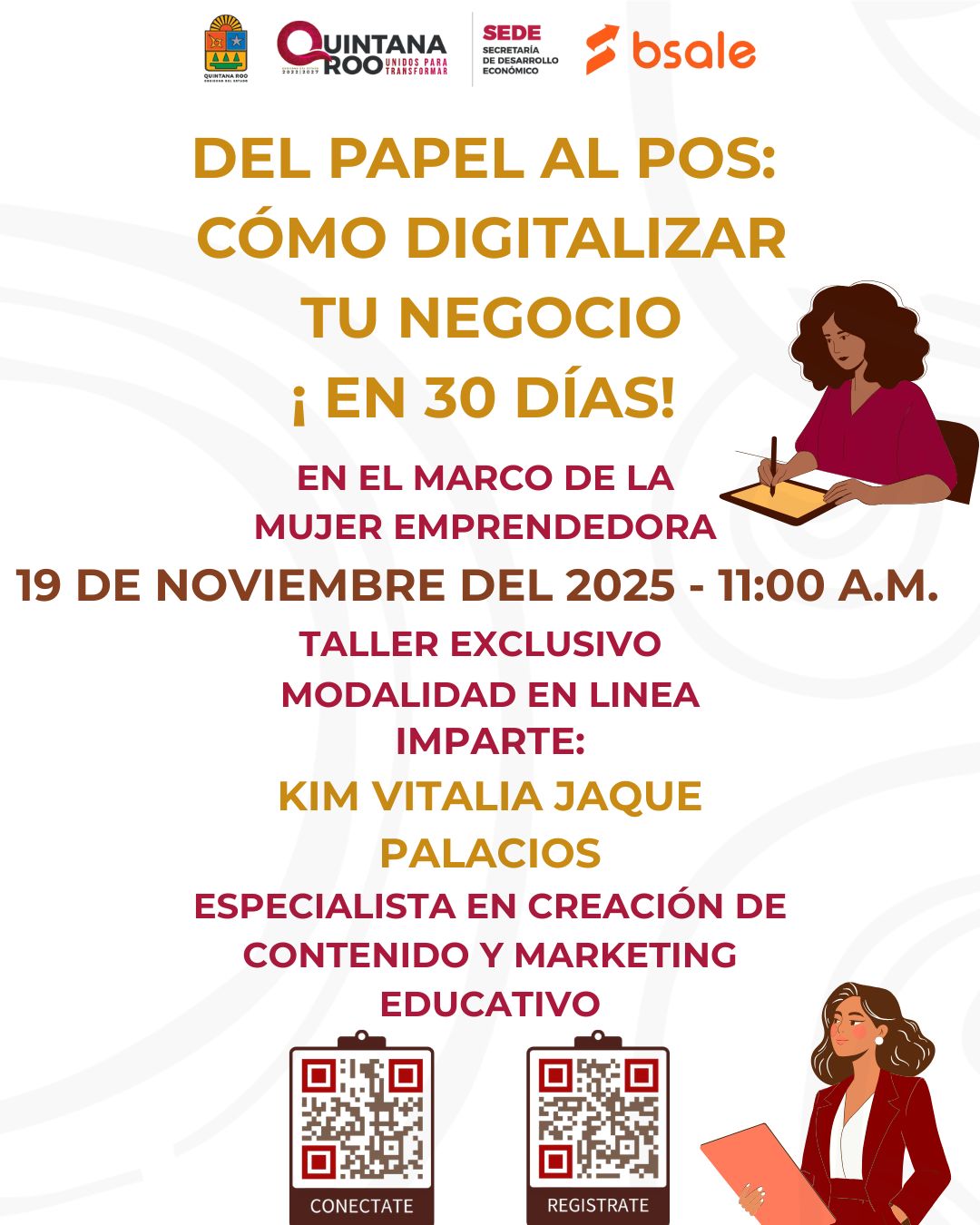 La capacitación, titulada “Del papel al POS: Cómo digitalizar tu negocio en 30 días”, se llevará a cabo este 19 de noviembre a las 11:00 de la mañana en modalidad en línea. El espacio está diseñado para brindar herramientas prácticas que permitan a las emprendedoras dar el salto a procesos digitales que optimicen la operación y competitividad de sus negocios.