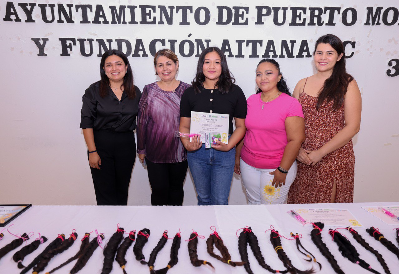 La presidenta municipal entregó 42 trenzas recolectadas en la campaña de donación de cabello organizada por el DIF Puerto Morelos, en el marco de la jornada “Alas de Esperanza”, destinada a recaudar fondos para tratamientos, alimentación y traslados de niñas, niños y familias que enfrentan el cáncer.