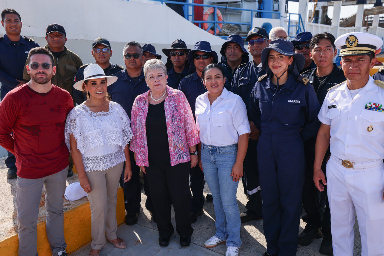 Puerto Morelos, Quintana Roo a 5 de julio de 2025.- Durante la visita de la secretaria de Medio Ambiente y Recursos Naturales Alicia Bárcena a Quintana Roo, para constatar la estrategia integral contra el sargazo, la presidenta municipal de Puerto Morelos Blanca Merari Tziu Muñoz, se sumó al recorrido que encabezó la gobernadora Mara Lezama en el municipio.