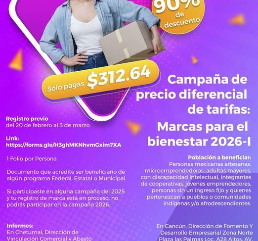 El Gobierno de Quintana Roo anunció el arranque de la campaña “Marcas para el Bienestar 2026-I”, un programa que permitirá a sectores prioritarios acceder al registro de marca con un…