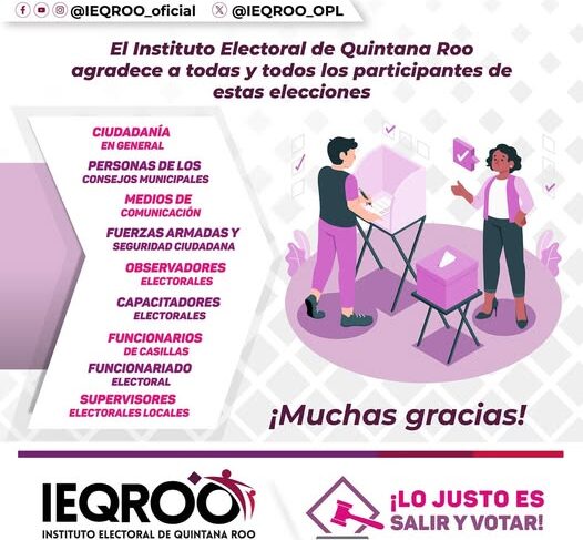 El Instituto Electoral de Quintana Roo agradece y reconoce el desempeño de quienes organizaron, participaron y llevaron a cabo la jornada electoral ciudadana libre y pacífica. Gracias ciudadanía quintanarroense por…