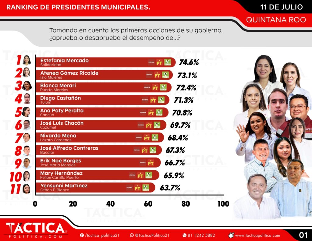 Playa del Carmen, Quintana Roo, 14 de julio de 2025.– Con apenas unas semanas al frente del gobierno municipal, Estefanía Mercado ya se posiciona como la alcaldesa mejor evaluada de Quintana Roo, según la encuesta más reciente realizada por la firma Táctica Política. Este reconocimiento no solo refleja el respaldo ciudadano, sino también el impacto inmediato de su estilo de gobernar: cercano, eficiente y con enfoque en resultados concretos.
