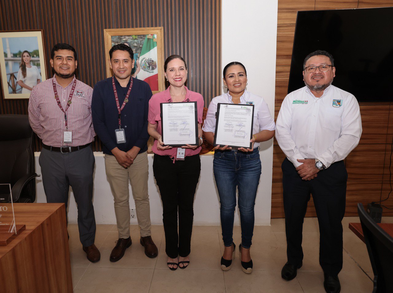 En la firma del convenio estuvieron presentes Jorge Mendoza, director de Servicios Académicos y Escolares; Iván Merino Martínez, coordinador de Admisiones y Promoción; así como el director de Recursos Humanos del Ayuntamiento, Santos Julián Medina Cab.