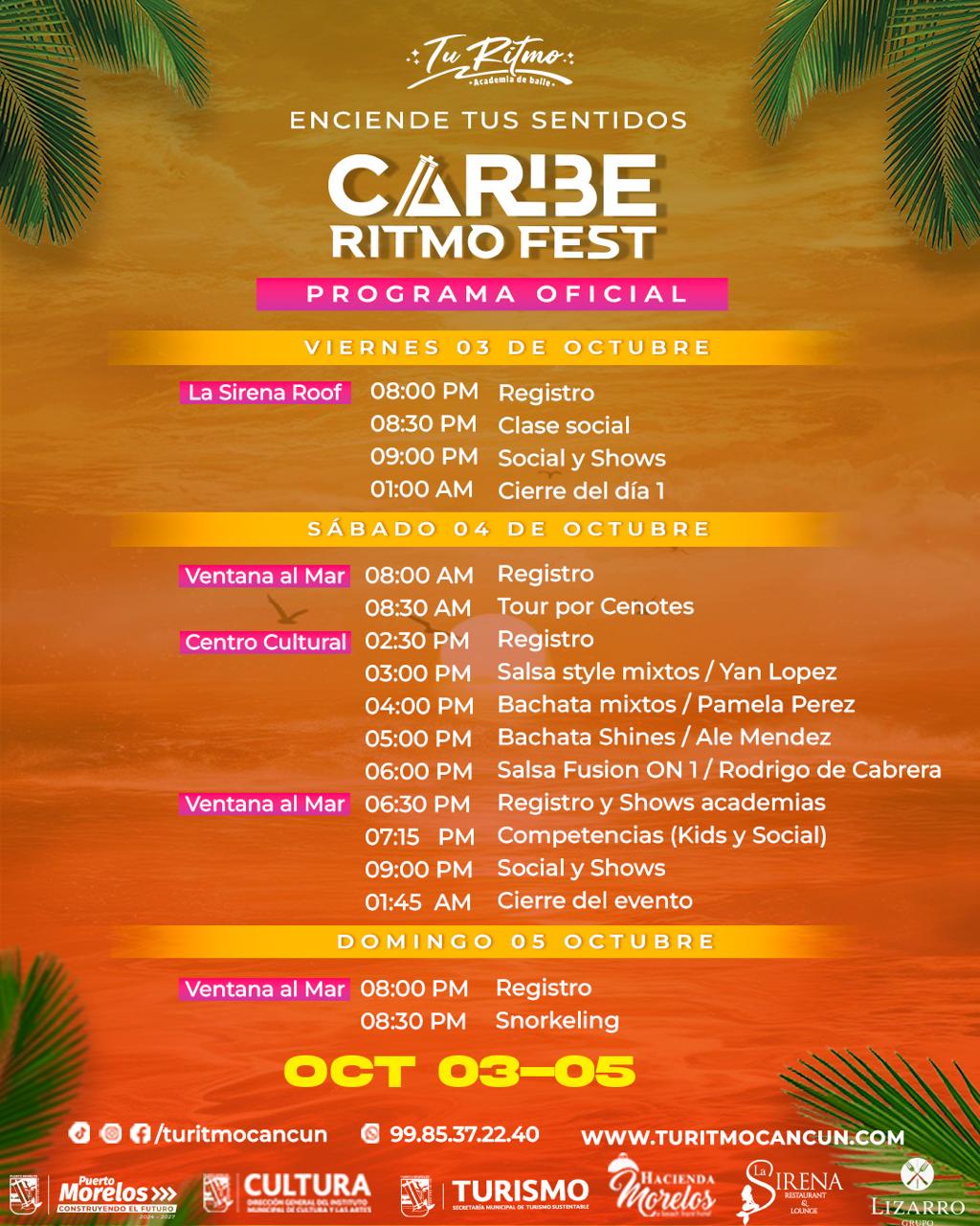 La directora del Instituto Municipal de Cultura y las Artes, Adriana Nava Gómez, señaló que el Caribe Ritmo Fest se distingue por su carácter colaborativo, al reunir a restauranteros, hoteleros, náuticos y propietarios de parques de la Ruta de los Cenotes. Asimismo, agradeció a escuelas de baile de Benito Juárez, Playa del Carmen y Puerto Morelos, en particular la Academia Tu Ritmo, de Cancún.