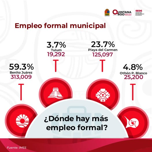 El segundo lugar en generación de empleo formal lo ocupa Solidaridad (Playa del Carmen) con un 23.7%, seguido por Othón P. Blanco (Chetumal) con un 4.8% del total de trabajadores asegurados en la entidad.