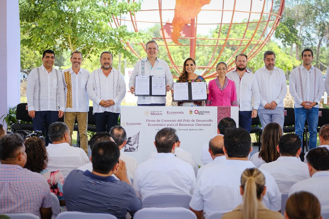 El secretario de Desarrollo Económico, @paulcarrillodec , acompañó a la gobernadora @maralezamaoficial y al secretario @marcelo.ebrard en la firma del convenio para establecer el PODECOBI Chetumal, el primer polo de bienestar del estado y el segundo a nivel nacional.