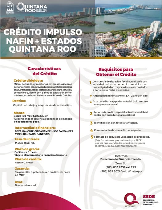 Las personas interesadas pueden acudir a la Secretaría de Desarrollo Económico para recibir orientación directa sobre requisitos, montos y plazos disponibles. También se habilitó la línea telefónica (983) 833 4354 ext. 229 para mayor información.