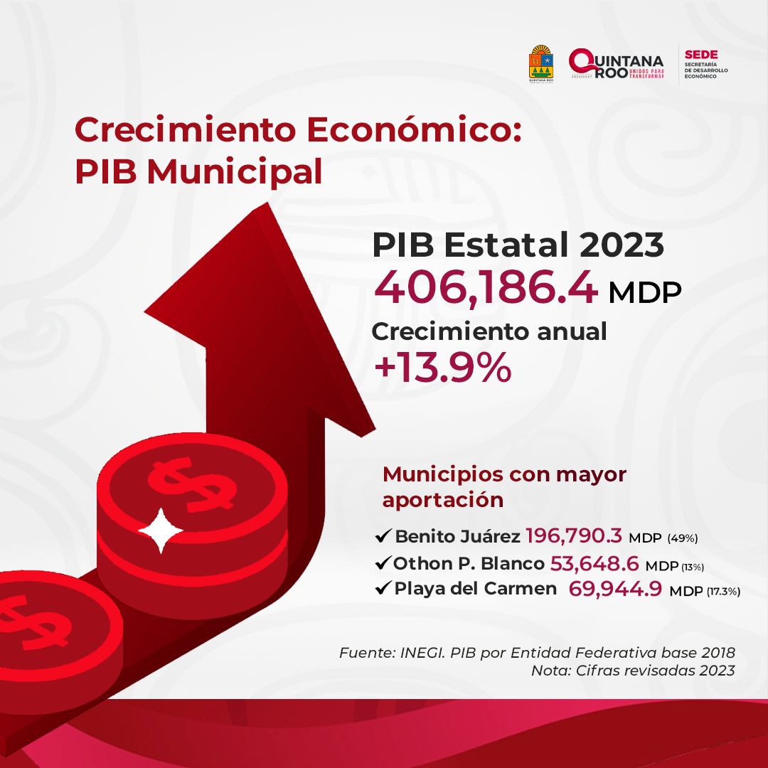 El repunte económico no es casualidad. Según la Secretaría de Desarrollo Económico (SEDE), este avance está impulsado principalmente por el desarrollo sostenido de varios municipios clave, destacando Benito Juárez (Cancún), que contribuyó con casi la mitad del PIB estatal. Le siguen Solidaridad (Playa del Carmen) con cerca de 70 mil millones de pesos, y Othón P. Blanco (Chetumal), que reportó una aportación superior a los 53 mil millones de pesos.